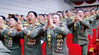 7차 당대회장인 4·25문화회관에서 갈채하는 북한 고위 장교들. 공안정치가 개막된 것을 축하하는 것인가(TV 화면 캡처).