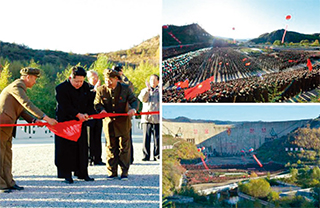 4월 23일자 조선중앙통신에 보도된 백두산영웅청년 3호 발전소를 시찰하는 김정은. 김정은은 “우리의 미더운 백두청춘들이 명령을 넉 달 앞당겨 노동당 제7차 대회를 앞두고 완공해 새로운 영웅청년 신화를 창조했다”며 기뻐했으나, 부실공사로 이 댐은 물이 새는 것으로 확인되었다.