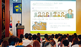 한반도 상태에 대해 특강을 한 유호열 수석부의장. 김정은이 처형한 북한 요인을 설명하고 있다.