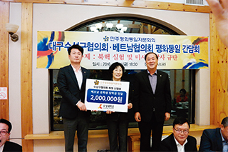 대구 수성구협의회(회장 신철범)는 10월 14일 베트남협의회(회장 유명식)와 ‘수성구협의회·베트남협의회 교류를 위한 협약’을 맺은 후 수성대에 재학 중인 베트남 유학생을 위한 장학금 200만 원을 수성대에 기탁했다. 신철범 수성구협의회장은 “베트남협의회와의 상호 교류 협약을 맺고 그 첫 번째로 수성대에 재학 중인 베트남 유학생들을 위한 장학금을 마련하게 됐다”고 그 배경을 설명했다.