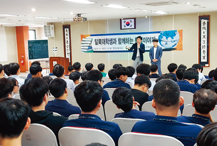 전북 전주시협의회(회장 고영호)는 9월 19일 전주고등학교 시청각실에서 2학년 재학생과 교직원, 자문위원 등 400여 명이 모인 가운데 ‘탈북 대학생과 함께 하는 통일 이야기’를 개최했다. 북한을 이해하기 위해 진행된 강연에서는 한승호 경동미래연구소 팀장이 북한의 일상과 북한 청소년의 삶, 그리고 통일을 준비하는 청소년의 자세 등에 대해 이야기했다. 서울대에서 우주항공공학을 전공하고 있는 탈북 대학생 김준선 군과 학생들은 통일에 대한 서로의 생각을 이야기하는 시간도 가졌다.