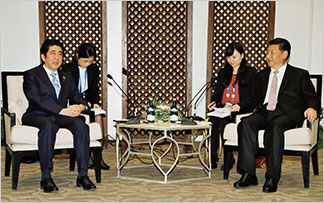 <사진> 시진핑 중국 국가주석(오른쪽)과 아베 일본 총리가 4월 22일 인도네시아 자카르타에서 열린 반둥회의 60주년 기념 아시아·아프리카 정상회의에서 회담을 하고 있다.